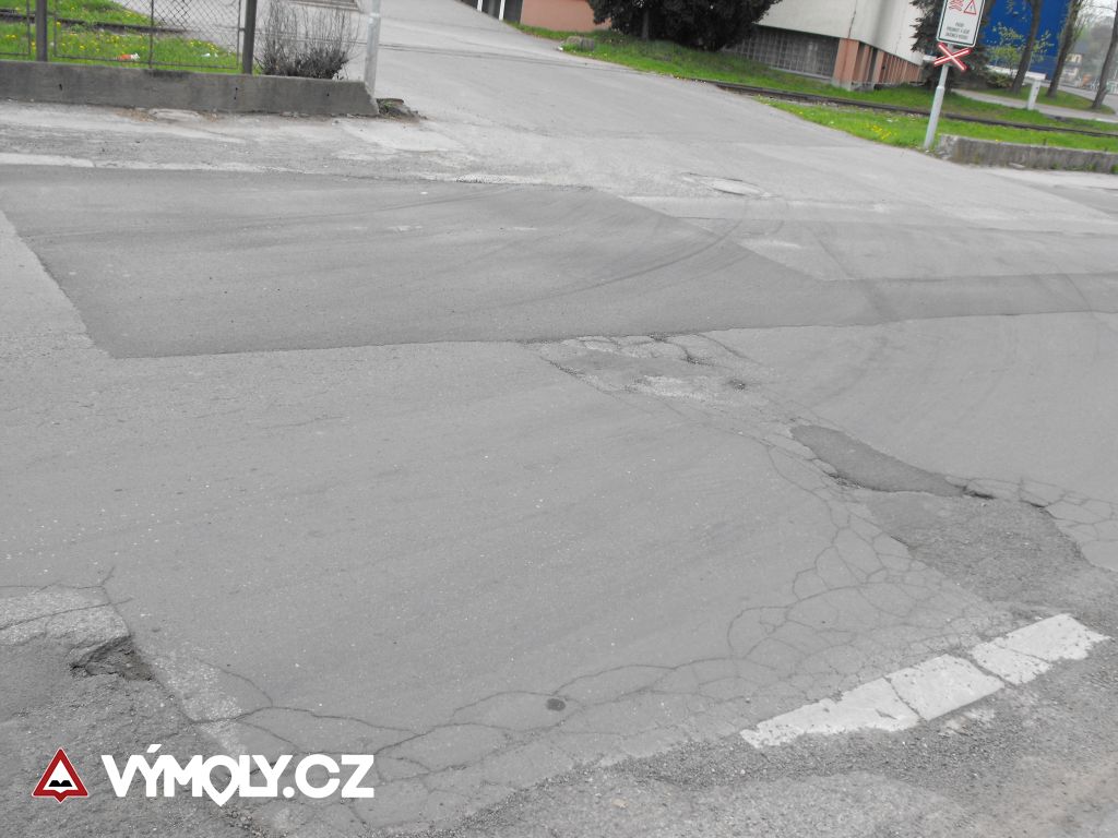 velké hluboké díry na Huťskej ulici blízko křižovatky s Průmyslovou ulicí